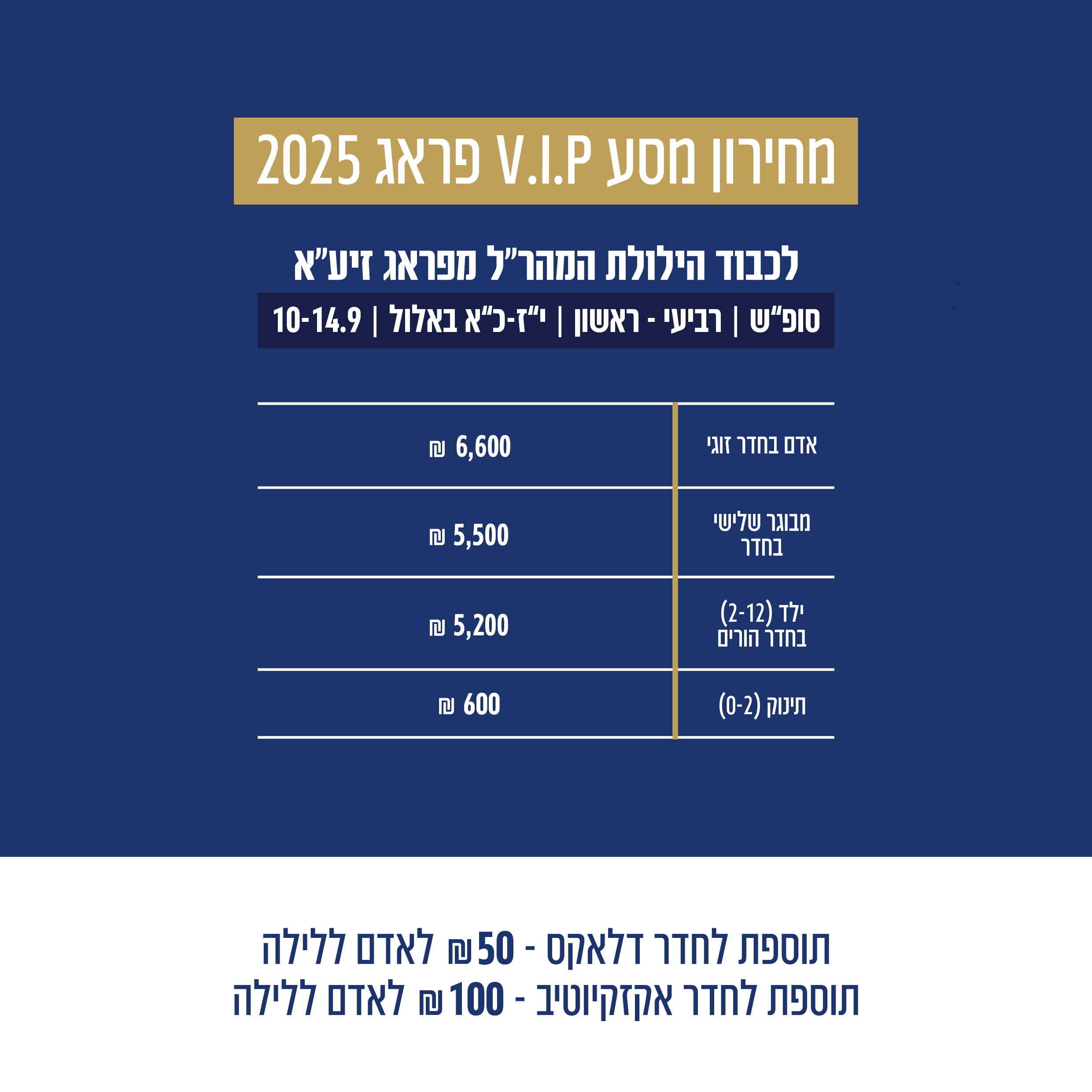 לאחר הנחיתה בשדה התעופה הבינלאומי של פראג נצא לסיור הכרות עם אחת הערים היפות באירופה. בתום הסיור נגיע לתפילה בציונו של ה"נודע ביהודה" לישועת הכלל והפרט בתום התפילה נצא למלון 'קינג דויד' להתארגנות וקבלת חדרים.